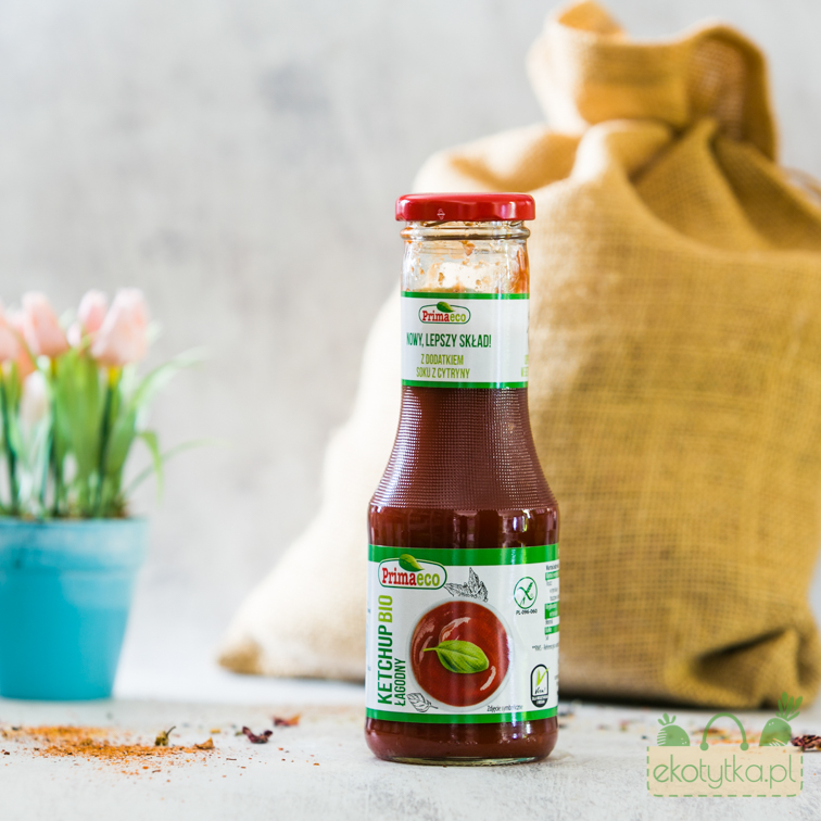 Ketchup łagodny BIO stworzony z wyselekcjonowanych pomidorów i świetnie skomponowanej mieszanki ziół i przypraw. Wyprodukowany z dużej ilości pomidorów, pozbawiony zbędnych substancji chemicznych i polepszaczy. Zawiera wiele cennych minerałów jak fosfor, cynk, magnez, potas, wapń oraz witamin z grupy B (B1, B2, B3, B5, B6, B9), C, E, K. Pomidor jest jednym z niewielu warzyw, które poddane obróbce termicznej nie tracą cennych właściwości, wręcz przeciwnie. Pod wpływem wysokiej temperatury, zawarty w pomidorach likopen staje się lepiej przyswajalny. Jego zawartość w pomidorach przetworzonych jest 3 razy większa niż w świeżych.