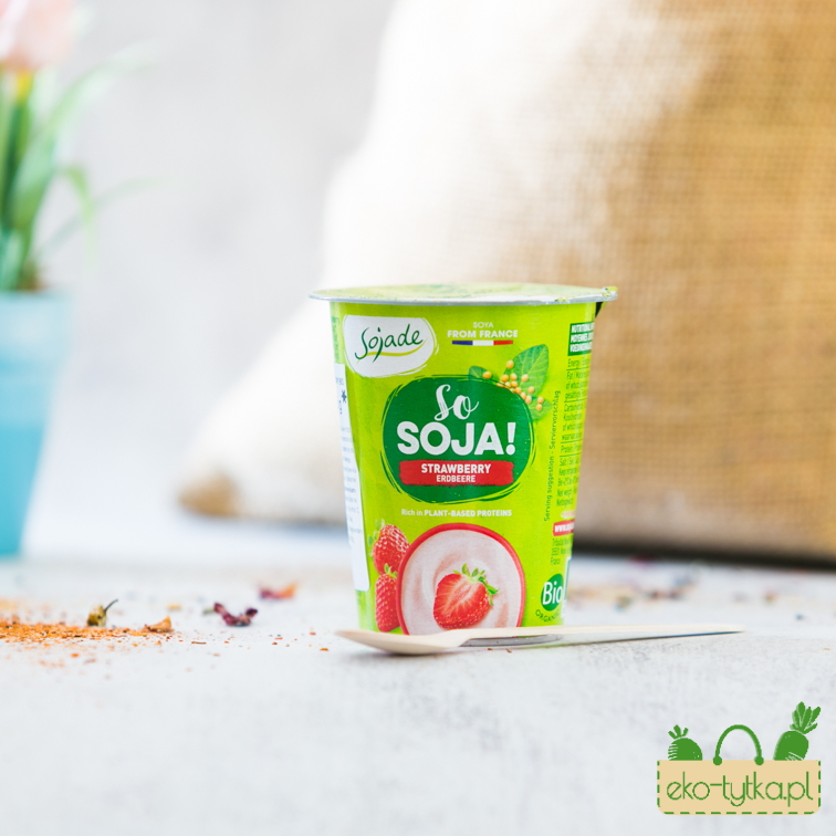 Produkt sojowy truskawkowy BIO. Smaczna alternatywa dla nabiału. Kremowy produkt sojowy którym z powodzeniem można zastąpić tradycyjny jogurt, idealna przekąska na drugie śniadanie czy zdrowy deser. Dostępne są także opcje smakowe: malina-marakuja, mango-kokos, naturalny, mango-brzoskwinia, waniliowy czy z borówkami. Sojade BIO nie zawiera sztucznych dodatków, wypełniaczy czy ulepszaczy.